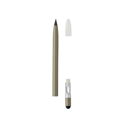 „Wieczny” ołówek z gumką, aluminiuowy trzon, dzięki wykorzystaniu specjalnej wolnościerającej się grafitowej końcówki długość pisania ołówka to około 20 000 metrów, notatki można zmazać standardową gumką do mazania, ślad węglowy produktu: 0,12 kg CO2