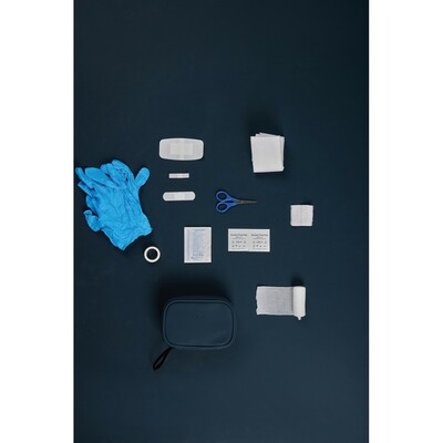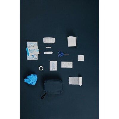 Apteczka, kompaktowa konstrukcja, zamykana na zamek błyskawiczny, wykonana z materiałów pochodzących z recyklingu z certyfikatem RCS, całkowita zawartość materiałów z recyklingu obliczona na podstawie wagi całkowitej przedmiotu: 23%