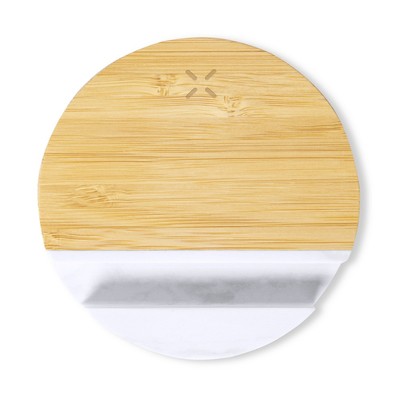 Bambusowa ładowarka bezprzewodowa 15W, działa z telefonami posiadającymi możliwość ładowania indukcyjnego, stojak na telefon wykonany z ekstraktu z marmuru, ochrona przed przegrzaniem, przeładowaniem i spięciem, wejście USB typu C, kabel USB typu C w komplecie