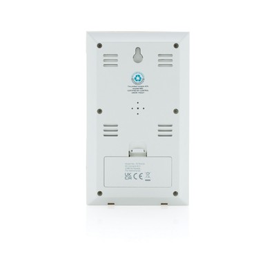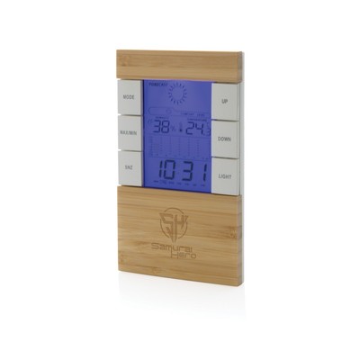 Stacja pogodowa, wykonana z certyfikowanego ABS z recyklingu oraz bambusa z certyfikatem FSC®, zawartość materiałów z recyklingu obliczona na podstawie wagi całkowitej przedmiotu: 42%, funkcje: temperatura, data, czas, wilgotnośc powietrza, baterie w komplecie, w pudełku kraftowym z certyfikatem FSC® mix, ślad węglowy produktu: 0,82 kg CO2