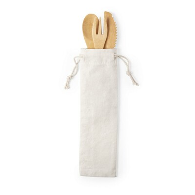 Zestaw sztućców bambusowych, w komplecie łyżka, nóż i widelec, w bawełnianym woreczku