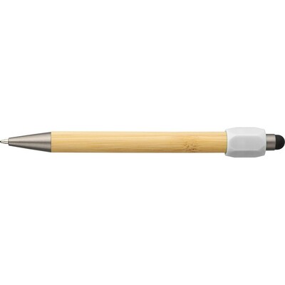 Bambusowy długopis z funkcją spinnera z ABS z recyklingu, czarna końcówka dotykowa na przycisku, wyposażony w mechanizm przyciskowy, wkład o grubości 1,0 mm oraz niebieski tusz o szacunkowej długości pisania 800 metrów, ikona ABS z recyklingu na produkcie