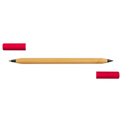 Długopis 2 w 1, „wieczny” ołówek, dzięki wykorzystaniu specjalnej wolnościerającej się końcówki długość pisania ołówka to około 1500 metrów, naostrzony, bambusowy trzon, dwie kolorowe zatyczki wykonane z papieru