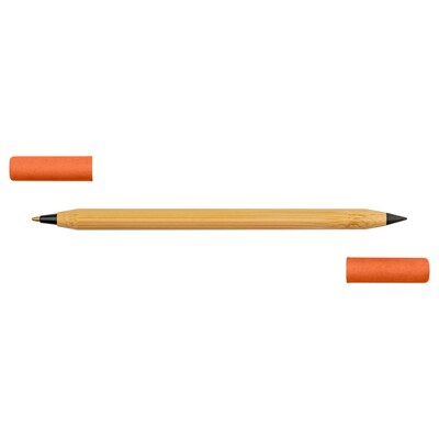 Długopis 2 w 1, „wieczny” ołówek, dzięki wykorzystaniu specjalnej wolnościerającej się końcówki długość pisania ołówka to około 1500 metrów, naostrzony, bambusowy trzon, dwie kolorowe zatyczki wykonane z papieru