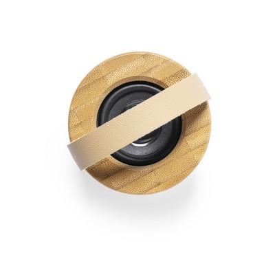 Głośnik bezprzewodowy BT 5.0 3W z uchwytem, obudowa wykonana z bambusa, bateria 300 mAh, lampka LED, zasięg do 10 m, ładowany przez USB, wejście USB typu C, kabel USB typu C w komplecie