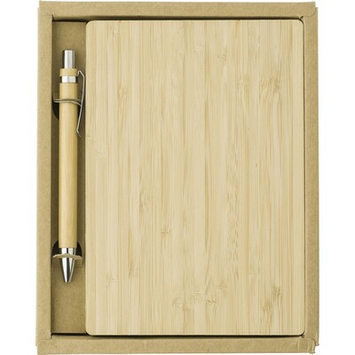 Bambusowy notatnik (ok. B6, 128 kartek w linie), bambusowy długopis w komplecie, w pudełku z papieru kraftowego