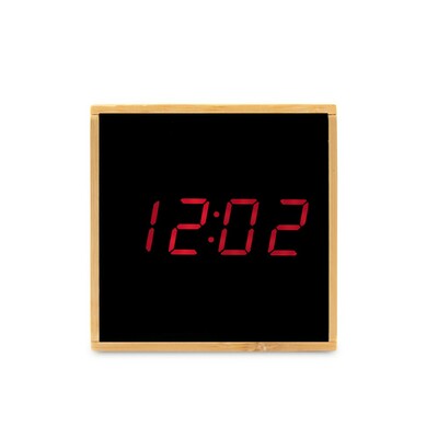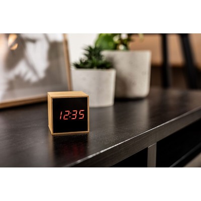 Bambusowy zegar na biurko, wyświetlacz LCD, zasilany przez kabel (w komplecie) 5V 500 mA, alternatywne źródło zasilania: 3 baterie AAA (nie są dołączone), możliwość zamontowania baterii CR2032 (nie jest dołączona) podtrzymującej ustawienia po odłączeniu od zasilania, funkcje: czas, data, temperatura, alarm (możliwość ustawienia 3 alarmów na 3 różne godziny)