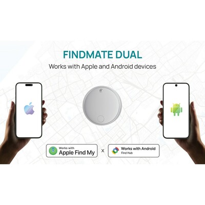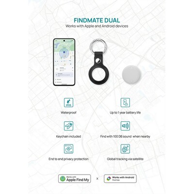 Bezprzewodowy wykrywacz kluczy, lokalizator, wykonany z ABS z recyklingu, kompatybilny ze wszystkimi urządzeniami iOS (aplikacja Apple Find My) oraz z urządzeniami Android (aplikacja Find Hub), wbudowany głośnik umożliwia łatwe znalezienie wykrywacza, czas pracy na jednej baterii wynosi do 1 roku, wymienialna bateria CR2032, wodoodporny IPX5