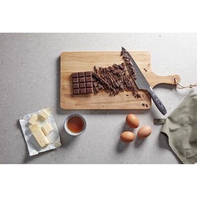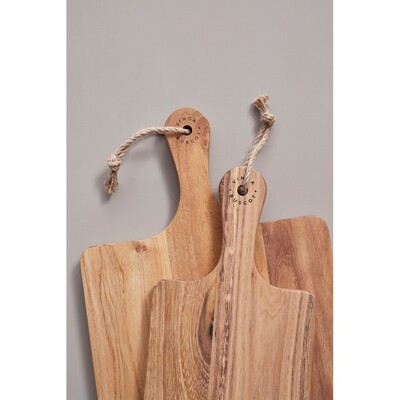 Deska do krojenia, serwowania, wykonana z drewna tekowego z certyfikatem FSC®, które dzięki swoim naturalnym właściwościom z czasem ciemnieje, dzięki wysokiej zawartości oleju drewno jest bardzo odporne i wytrzymałe