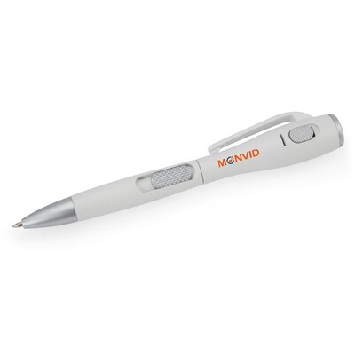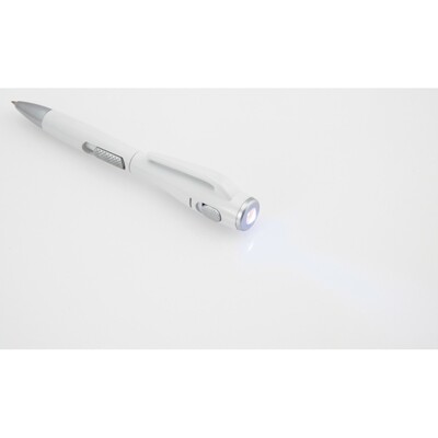 Długopis z lampką LED, wkład w niebieskim kolorze, profilowany trzon o dużej średnicy ułatwia chwyt, produkt wykonany z ABS
