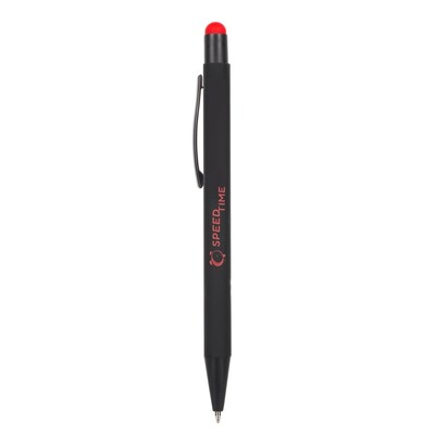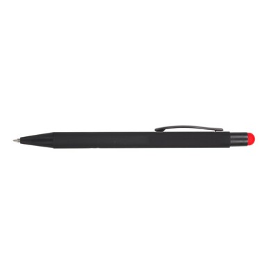 Długopis z czarnym trzonem, posiada gumowe wykończenie, kolorowa końcówka touch pen umożliwiająca obsługę ekranów dotykowych, grawer ukazuje powierzchnię w kolorze zbliżonym do koloru końcówki touch pen lub w kolorze białym, wkład w niebieskim kolorze, produkt wykonany z aluminium