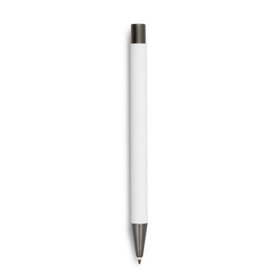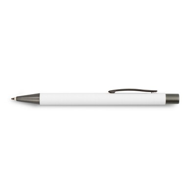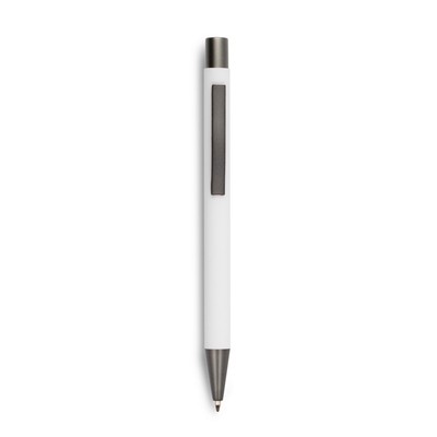 Długopis z kolorowym trzonem i szarymi elementami, posiada gumowe wykończenie, wkład w niebieskim kolorze, produkt wykonany z aluminium, plastiku i metalu