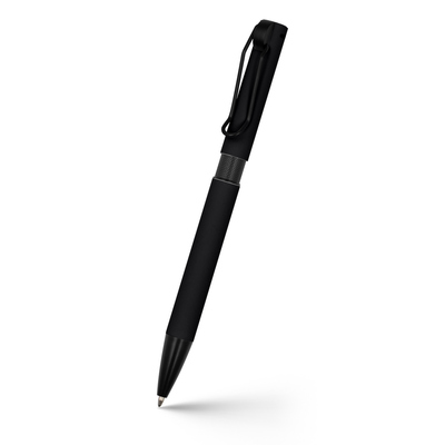 Długopis z kolorowym gumowanym trzonem, czarnymi elementami i drucianym klipem