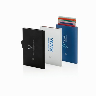 Solidne etui na karty kredytowe C-Secure z ochroną RFID, mieści do 7 kart lub do 5 z tłoczeniem, posiada suwak boczny do wysuwania kart, wykonane z aluminium, ślad węglowy produktu: 0,65 kg CO2