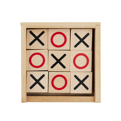 Gra „kółko i krzyżyk” w pudełku, zawiera 9 klocków z symbolami kółek i krzyżyków, może być ciekawym sposobem na ćwiczenie strategii i logicznego myślenia, produkt wykonany z drewna