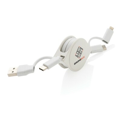 Zwijany kabel do ładowania z 4 końcówkami: USB, 2 x typu C i 2 w 1 (micro USB oraz kompatybilną z urządzeniami iOS), obudowa wykonana z ABS pochodzącego z recyklingu, posiadają certyfikat RCS (Recycled Claim Standard), który jest stosowany gdy produkt jest wykonany częściowo lub w całości z materiałów pochodzących z recyklingu, nie zawiera PVC, ślad węglowy produktu: 0,16 kg CO2