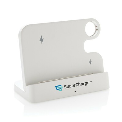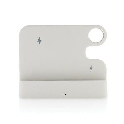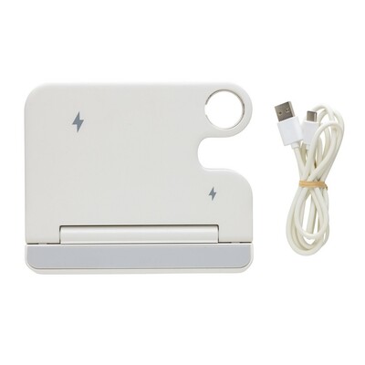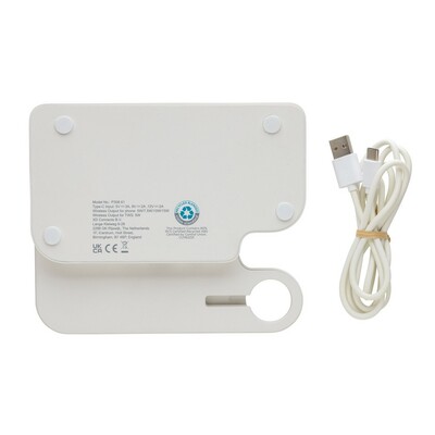 Ładowarka bezprzewodowa 2 w 1 15W, składana, stojak na telefon, wykonana z ABS z recyklingu, ładowarka bezprzewodowa 15W, ładowarka bezprzewodowa 5W do słuchawek i drobnych akcesoriów, posiada gniazdo na kabel do ładowania smartwatcha iOS, wyjścia USB i USB typu C do ładowania za pomocą kabla, działa z telefonami posiadającymi możliwość ładowania indukcyjnego, kabel 120 cm z TPE z recyklingu w komplecie, w pudełku z certyfikatem FSC® mix