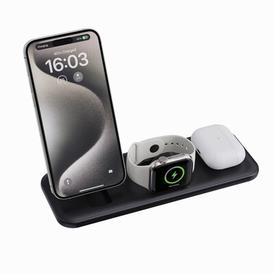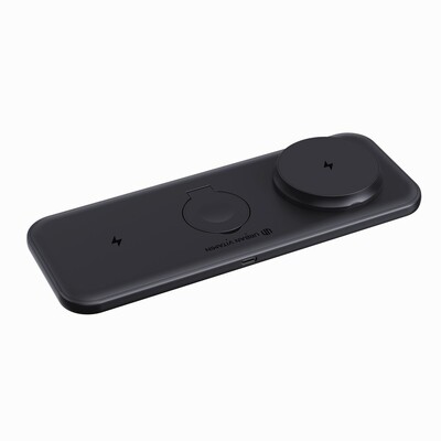 Ładowarka bezprzewodowa 3 w 1, ładowarka bezprzewodowa do telefonu 15W, ładowarka bezprzewodowa 5W do słuchawek i innej drobnej elektroniki, ładowarka bezprzewodowa do smartwatcha (działa tylko z urządzeniami iOS), składana konstrukcja, działa z telefonami posiadającymi możliwość ładowania indukcyjnego, wykonana z ABS z recyklingu z certyfikatem RCS, całkowita zawartość materiałów z recyklingu obliczona w oparciu o wagę całkowitą przedmiotu: 37%, kabel z TPE z recyklingu w komplecie