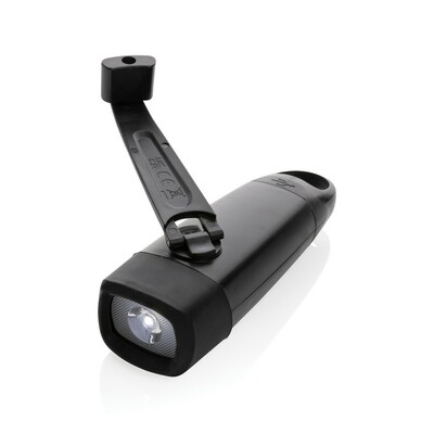 Latarka LED z dynamo, moc 120 lumenów, wbudowany akumulator o pojemności 620 mAh pozwala na świecenie do 2 godzin na jednym ładowaniu, wejście USB typu C, wykonana z ABS z recyklingu z certyfikatem RCS, całkowita zawartość materiałów obliczona na podstawie wagi całkowitej przedmiotu: 30%, ślad węglowy produktu: 0 kg CO2