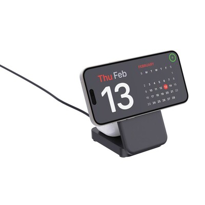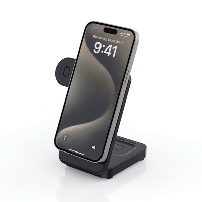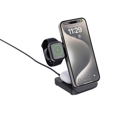 Magnetyczna ładowarka bezprzewodowa 15W 3 w 1, ładowarka bezprzewodowa 15W do telefonu, ładowarka bezprzewodowa 5W do słuchawek, ładowarka bezprzewodowa 2,5W do ładowania smartwatchy (kompatybilne wyłączenie z urządzeniami iOS), wskaźnik ładowania, 15 wbudowanych magnesów, działa z telefonami posiadającymi możliwość ładowania indukcyjnego, wejście USB-C 9V/2.2A, kabel 120 cm USB-C do USB-C w komplecie, wykonana z ABS z recyklingu, całkowita zawartość materiałów z recyklingu obliczona na podstawie wagi całkowitej przedmiotu: 34%