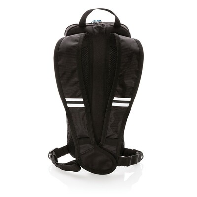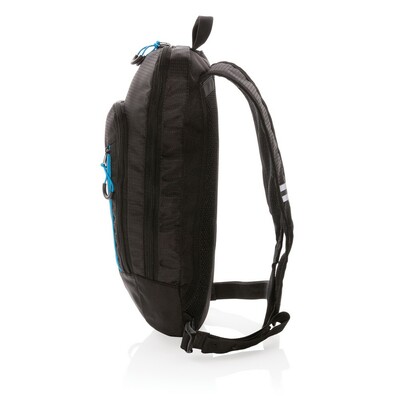 Mały plecak turystyczny, pojemność 7l, wykonany z wytrzymałej tkaniny poliestrowej, doskonale nadaje się do aktywności na świeżym powietrzu, wewnątrz kieszeń na butelkę, plecak posiada otwór do wyprowadzenia rurki nawadniającej, przednia kieszeń na zamek błyskawiczny, zintegrowana osłona przeciwdeszczowa, miękkie, regulowane paski na ramię, nie zawiera PVC, ślad węglowy produktu: 2,11 kg CO2