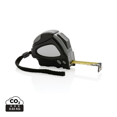 Miara 3 m, taśma o szerokości 16 mm z haczykiem i magnesami, przycisk blokady, wykonana z ABS pochodzącego z recyklingu z certyfikatem RCS (Recycled Claim Standard) który gwarantuje, że wykorzystane materiały pochodzą z recyklingu, całkowita zawartość materiału z recyklingu obliczona w oparciu o wagę całkowitą przedmiotu: 18%, uchwyt z TPR, w pudełku z papieru kraftowego z certyfikatem FSC® mix (Forest Stewardship Council), ślad węglowy produktu: 0,57 kg CO2