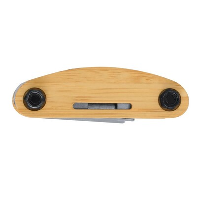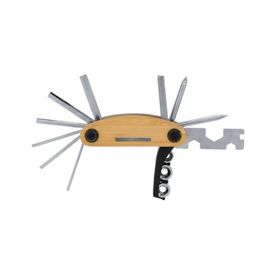 Narzędzie wielofunkcyjne, zestaw narzędzi rowerowych, 15 funkcji, 6 kluczy imbusowych, płaski śrubokręt, śrubokręt krzyżakowy, klucz płaski, 3 nasadki sześciokątne i adapter, produkt wykonany z bambusa i stali węglowej