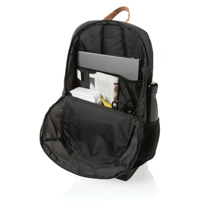 Plecak, przestronna przegroda główna, wewnątrz mniejsza, z przodu kieszeń na zamek na drobne akcesoria, wykonany z poliestrów pochodzących z recyklingu do produkcji których zostało ponownie wykorzystanych 16,65 butelek PET o pojemności 0,5 l, dzięki zastosowaniu technologii śledzącej AWARE™ wykorzystane włókna są identyfikowalne z pochodzenia, 2% wpływów z każdego sprzedanego produktu jest przekazywane na rzecz Water.org
