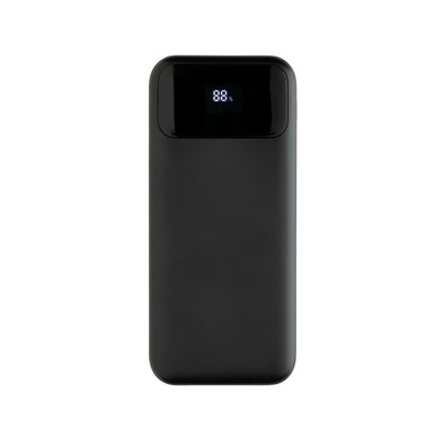 Power bank 10000 mAh, szybkie ładowanie, zintegrowane kable USB-C i Apple Lightning, dodatkowy port USB-C oraz USB-A, możliwość naładowania telefonu do czterech razy, cyfrowy wyświetlacz poziomu energii, wykonany z recyklingowanego ABS i TPE, zawartość materiałów z recyklingu: 21%, certyfikacja RCS, opakowanie z papieru kraft z certyfikatem FSC®, wolny od PVC, różnorodne napięcia i natężenia wyjściowe dla portów USB-A, USB-C i kabli wbudowanych