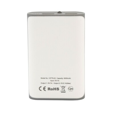 Power bank 6000 mAh, wyjścia 5V/2.1A oraz 5V/1A, wejście 5V/1A, 4 diody wskazujące poziom naładowania, lampka LED, w komplecie kabel micro USB
