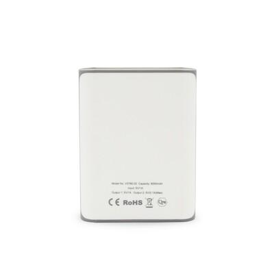 Power bank 8000 mAh, wyjścia 5V/2.1A oraz 5V/1A, wejście 5V/1A, 5 diod wskazujących poziom naładowania, lampka LED, w komplecie kabel micro USB
