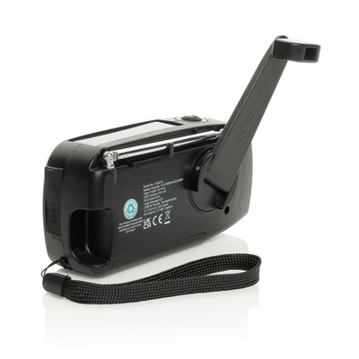 Radio survivalowe AM/FM, power bank 1800 mAh, latarka, możliwość ładowania za pomocą wbudowanej w tylnej części korby, posiada wbudowany panel słoneczny do ładowania, wykonany z ABS z recyklingu, całkowita zawartość materiałów z recyklingu obliczona na podstawie wagi całkowitej przedmiotu: 38%