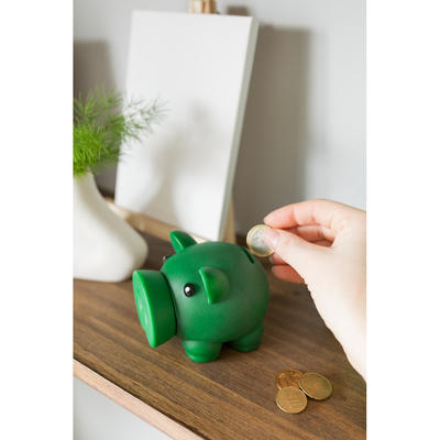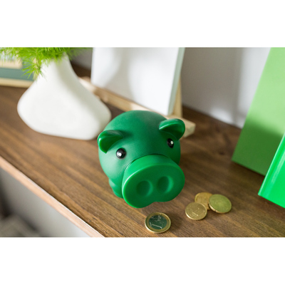 Skarbonka „świnka”, gumowe wykończenie zwiększa komfort użytkowania i odporność na uszkodzenia, produkt wykonany z PVC