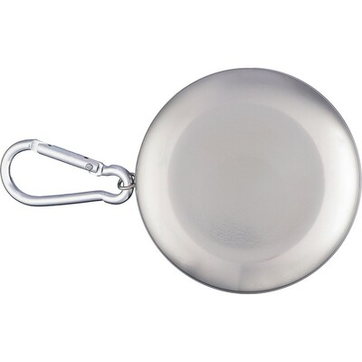 Składany kubek podróżny 220 ml z metalowym karabińczykiem umożliwiającym przypinanie, składana konstrukcja ułatwia pakowanie i przenoszenie, zapakowany w brązowy kartonik, produkt wykonany ze stali nierdzewnej