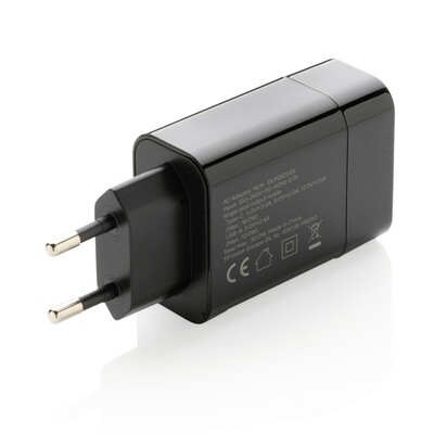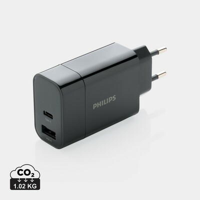 Ładowarka ścienna 30W Philips, wyjście USB 2A, wyjście szybkiego ładowania (PD) USB typu C umożliwia naładowanie urządzenia mobilnego w mniej niż godzinę (jeśli obsługuje szybkie ładowanie (PD)), wejście 100-240V, wyście USB typu C 5V/3A, 9V/2A, 12V/1.5A, wyjście USB 5V/2.4A (max 12W), moc całkowita 30W, w ozdobnym pudełku Philips, ślad węglowy produktu: 1,02 kg CO2