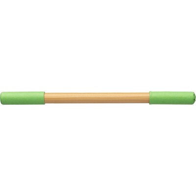 „Wieczny” ołówek i długopis w jednym, wolnościerająca się końcówka ołówka powoduje jego dłuższe zużycie, posiada dwie kolorowe zatyczki z kartonu, produkt wykonany z bambusa