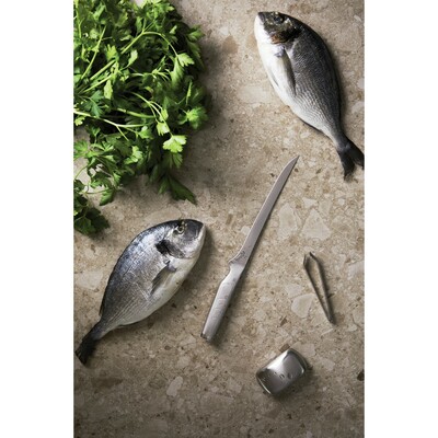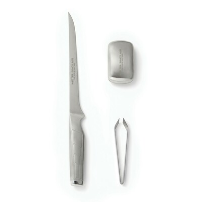 Zestaw do filetowania ryb, nóż do filetowania, szczypce do usuwania ości, metalowe mydło, które usuwa zapach ryb i czosnku, wykonane ze stali nierdzewnej, w pudełku upominkowym