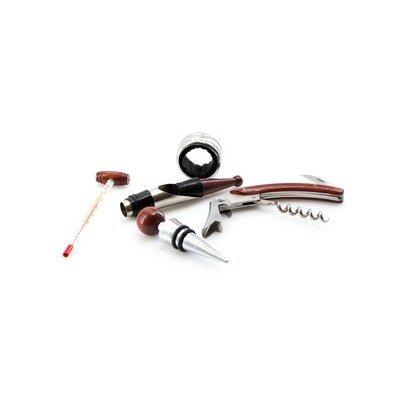 Zestaw do wina 5 el. w drewnianym pudełku, nóż kelnerski, pierścień, zatyczka, nalewak z zamknięciem i termometr