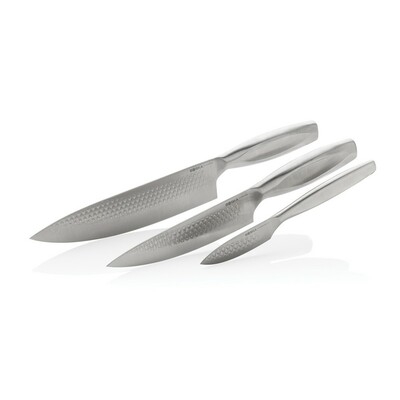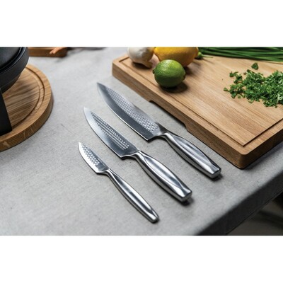 Zestaw noży kuchennych, wykonany ze stali nierdzewnej, nóż uniwersalny, nóż szefa kuchni oraz nóż do obierania, wyłącznie mycie ręczne, posiada dożywotnią gwarancję