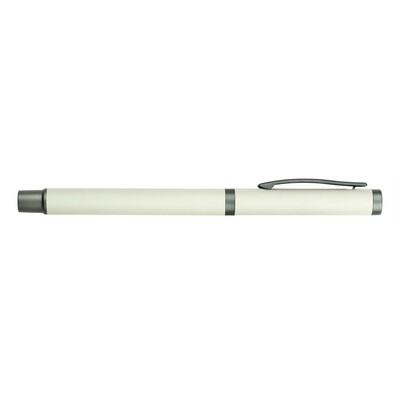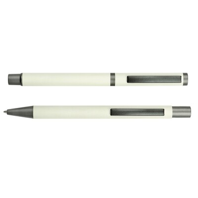 Zestaw piśmienniczy, długopis oraz pióro kulkowe z kolorowym trzonem i szarymi elementami, długopis klikany, piórko kulkowe ze skuwką, posiadają gumowe wykończenie, wkłady w niebieskim kolorze, dopasowane kolorystycznie pudełko podarunkowe w komplecie, produkt wykonany z aluminium i plastiku