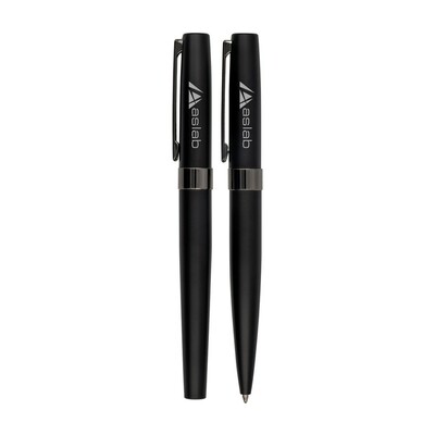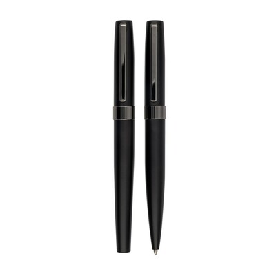 Zestaw piśmienniczy Mauro Conti, długopis oraz pióro kulkowe z czarnym trzonem i błyszczącymi elementami, długopis z mechanizmem obrotowym, piórko kulkowe ze skuwką, wkład długopisu w niebieskim kolorze, wkład pióra kulkowego w czarnym kolorze, czarne pudełko podarunkowe w komplecie, produkt wykonany z metalu