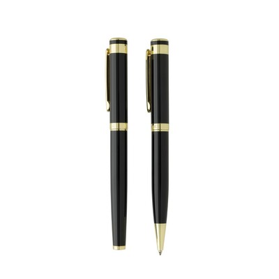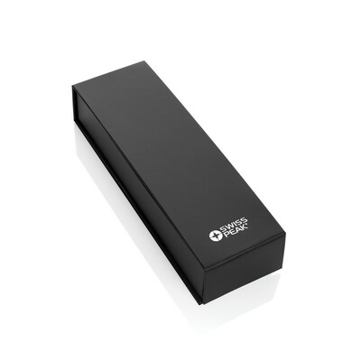 Ekskluzywny zestaw piśmienny, pióro żelowe oraz długopis z logotypem Swiss Peak wykonane z mosiądzu z recyklingu z certyfikatem RCS, akcenty w kolorze złotym, niebieski wkład, długość pisania długopisu ok. 1200 m, długość pisania pióra ok. 800 m, pudełko podarunkowe w komplecie, całkowita zawartość materiałów z recyklingu obliczona w oparciu o wagę całkowitą przedmiotu: 55%