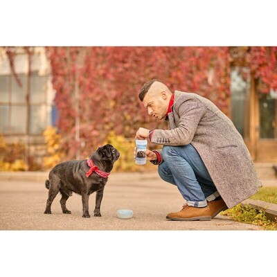 Zestaw podróżny dla psa, przegroda 280 ml na wodę z dozownikiem, przegroda 330 ml na jedzenie dla psa, pasek na rękę, 2 wieczka mogące służyć jako miski dla psa w komplecie