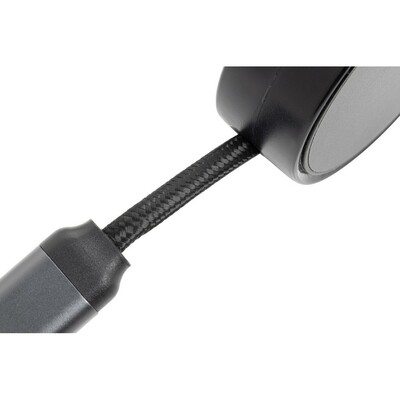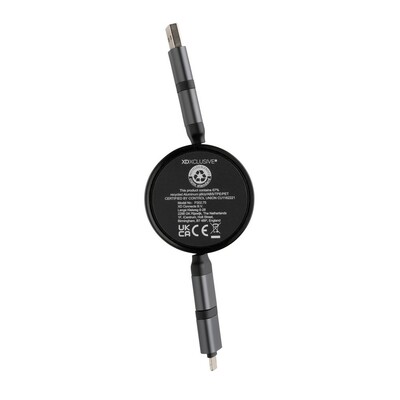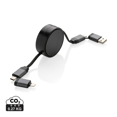 Zwijany kabel do ładowania i synchronizacji, końcówki: USB, 2 x USB typu C i 2 w 1 (micro USB i iOS), moc ładowania do 45W, wykonany z materiałów z recyklingu, całkowita zawartość materiałów obliczona na podstawie wagi całkowitej przedmiotu: 96%, ślad węglowy produktu: 0,27 kg CO2