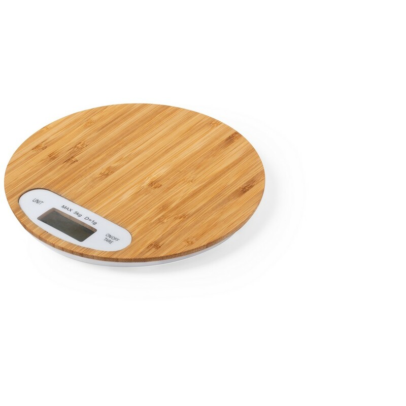 Bambusowa waga kuchenna, elektroniczny wyświetlacz, funkcja automatycznego wyłączania, funkcja tary, wybór jednostki wagi, limit wagi 5kg, bateria guzikowa w komplecie