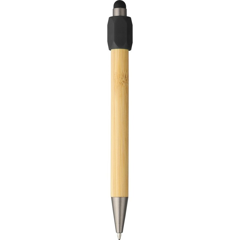 Bambusowy długopis z funkcją spinnera z ABS z recyklingu, czarna końcówka dotykowa na przycisku, wyposażony w mechanizm przyciskowy, wkład o grubości 1,0 mm oraz niebieski